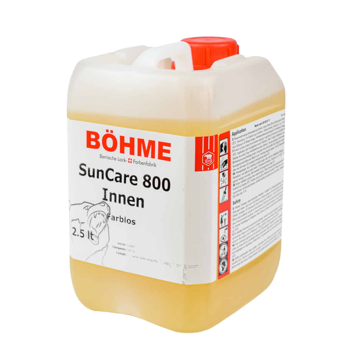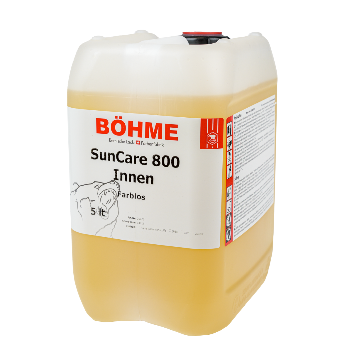 SunCare 800 stabiliseert effectief de kleur van natuurlijk en licht gebeitst hout in binnentoepassingen. De gebruikte UV-absorbers zijn wateroplosbaar, wat betekent dat een nabehandeling noodzakelijk is. Voor een langdurige bescherming dient SunCare 800 of SunCare 800 WF altijd te worden afgewerkt met minimaal één laag JetFinish of JetFinish 2K Natur.