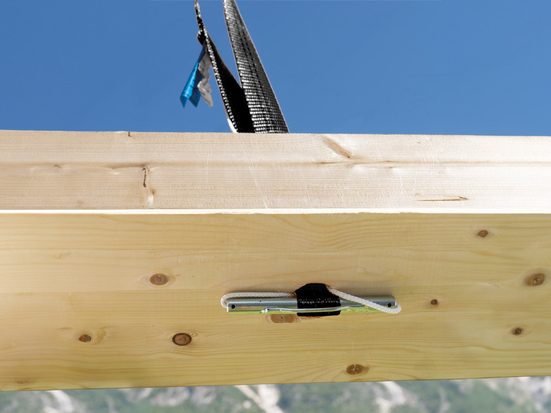 Na het boren van het gat in het te tillen element wordt de stalen pen erin geplaatst en in dwarse positie gezet. Vervolgens is het element klaar om opgetild te worden. De veiligheidslijn heeft geen hefrol, maar dient uitsluitend om de pen na de positionering eenvoudig te verwijderen. De DRAGON-riem, gecertificeerd volgens EN-1492-1, biedt maximale veiligheid en betrouwbaarheid. Dankzij zijn veelzijdigheid is hij ideaal voor houten elementen en draagt hij bij aan een aanzienlijke risicoreductie tijdens hijswerkzaamheden.