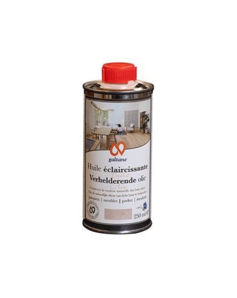 Laat uw hout weer leven door de Verhelderende olie van Galtane! Deze resistente olie dringt diep in het hout in en geeft een matte tot satijnglanzende afwerking. Op basis van plantaardige olie en natuurlijke hars. Toegepast op vloeren, trappen en meubels. Geeft hout een aangename en natuurlijk oppervlak. Ruikt aangenaam en is anti-statisch. Bevat wit pigment om de lichte kleur van houten vloeren, trappen en meubels te bewaren.