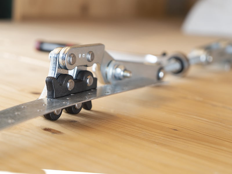 De bevestiging gebeurt met schroeven op twee platen. De paneeltrekker van Rothoblaas is GEKO, een essentieel gereedschap met meer veelzijdigheid en kracht dan SKORPIO balktrekker. De meeste timmerlieden bezitten echter beide modellen voor een efficiëntere werfwerking. GEKO wordt gebruikt voor de nauwkeurige montage van massieve houten panelen, plankenvloeren, gelamineerde elementen en meer. Dankzij de 360° draaiplaten kan het zelfs worden ingezet op moeilijk bereikbare plekken, zoals dakhellingen en hoeken. De bevestigingsschroeven laten na verwijdering minimale sporen achter in het hout, die eenvoudig kunnen worden opgevuld met een houtkleurige plamuur zoals PLASTUK. In combinatie met CLAMP1 kan het ook worden gebruikt om platen en geperforeerde banden aan te spannen.