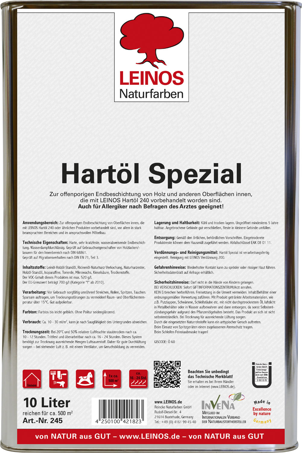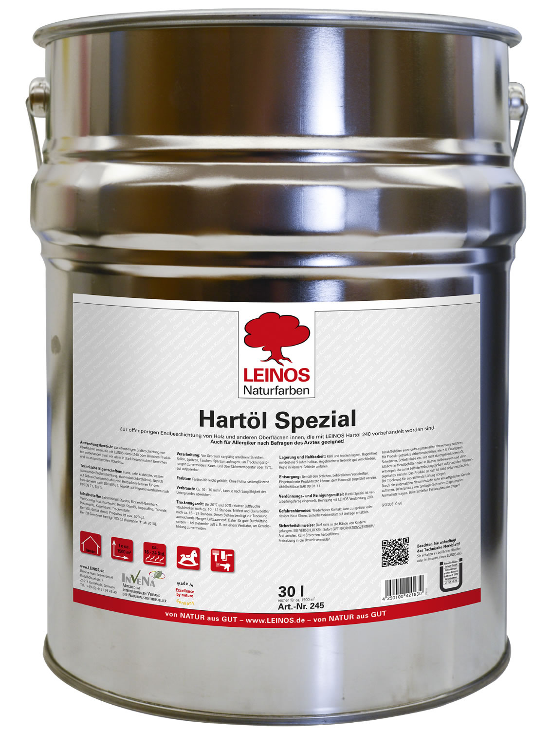 Hardolie Speciaal 245 is een harsrijke en washoudende eindcoating voor alle zwaar belaste oppervlakken zoals vloeren en veeleisende meubelbouw. Met uitmuntende polijsteigenschappen, is het een zeer krasvaste, harde, waterafstotende en waterdampdoorlatende eindlaag. Is kleurloos tot lichtgeel, zijdeglans zonder polijstmiddel.