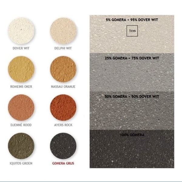 Kleuren | Dover wit, Delphi wit, Romeins oker, Nassau oranje, Djenné rood, Ayers Rock, Iquitos groen, Gomera grijs |