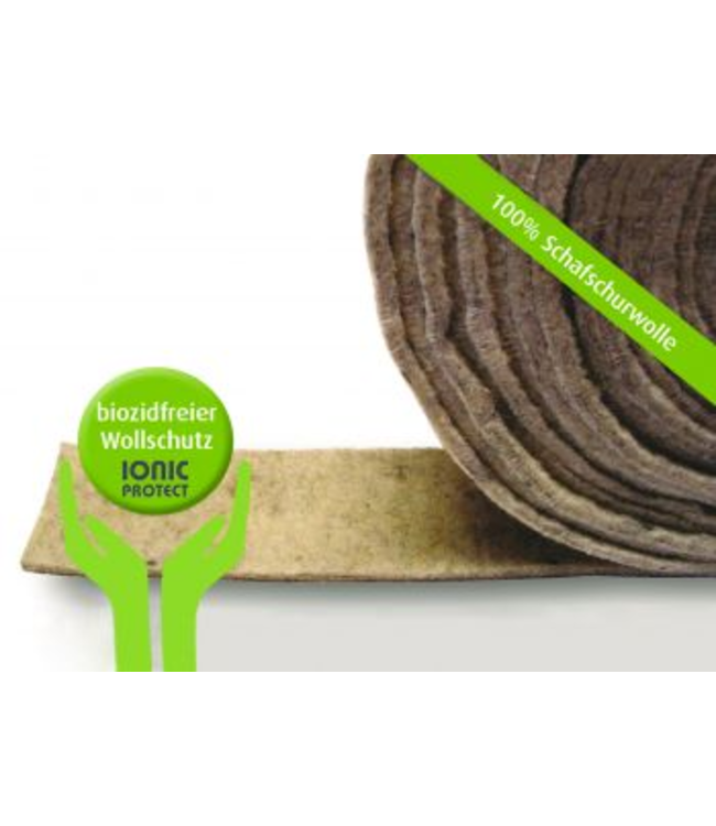 Schapenwolvilt kan aangeboden worden in 3,5 en 9 mm dik. Een geluidsreductie van 19 dB per 5mm dikte! De rollen zijn bruin van kleur allemaal 1 meter breed, behalve de viltband van 10 cm breedte.