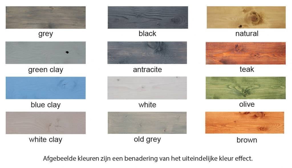 - Antracite, Black, Blue Clay, Brown, Green Clay, Grey, Naturel, Old Grey, Olive, Teak, White, White Clay