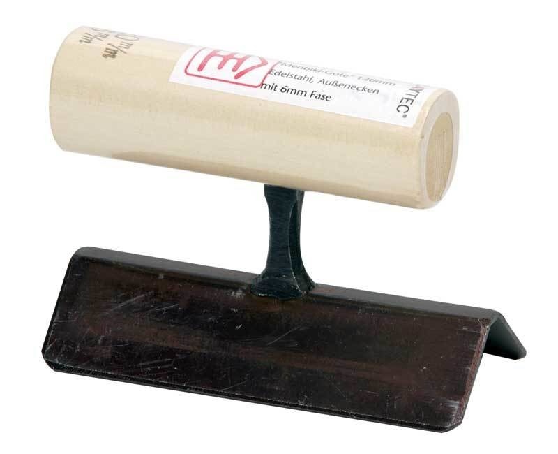 Troffel voor het maken van bramen met een gedefinieerde kwartcirkelafronding. Geschikt voor fijne kleipleisters. Staal, gesmeed, gebogen lemmet 90°, gelijkbenig. Nakakubi versie (= handvat in het midden). Plaatdikte 2,0 mm.