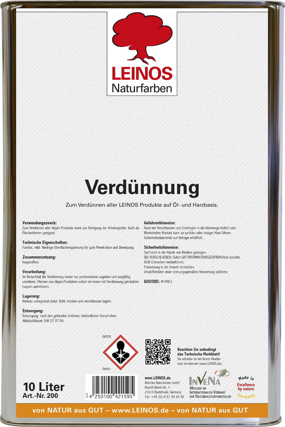 Leinos Verdunning en vlekverwijderaar 200 voor het verdunnen van alle olieachtige producten en voor het reinigen van de gereedschappen. Ook geschikt als vlekverwijderaar.